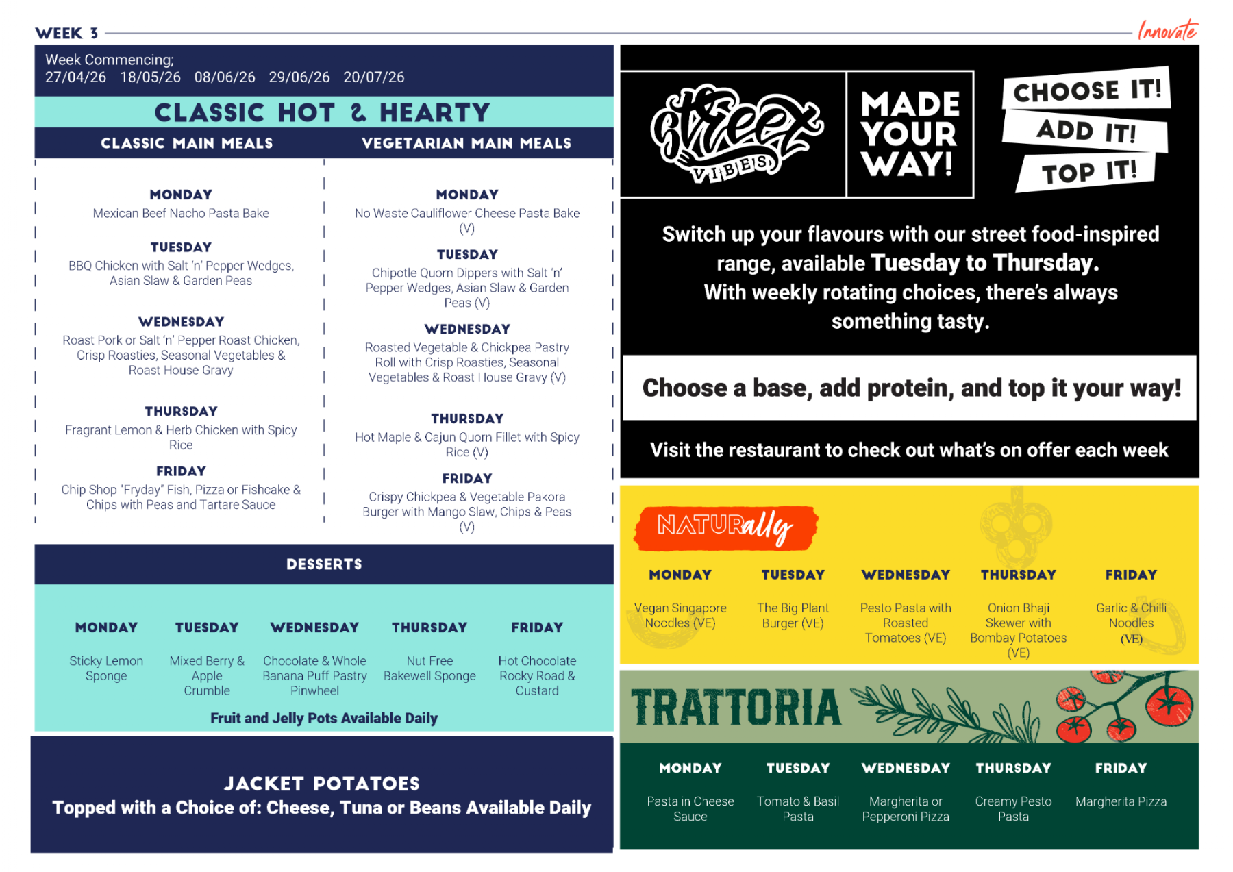 The menus rotate on a three-weekly basis. Please see below for further information on menus and meal deals.